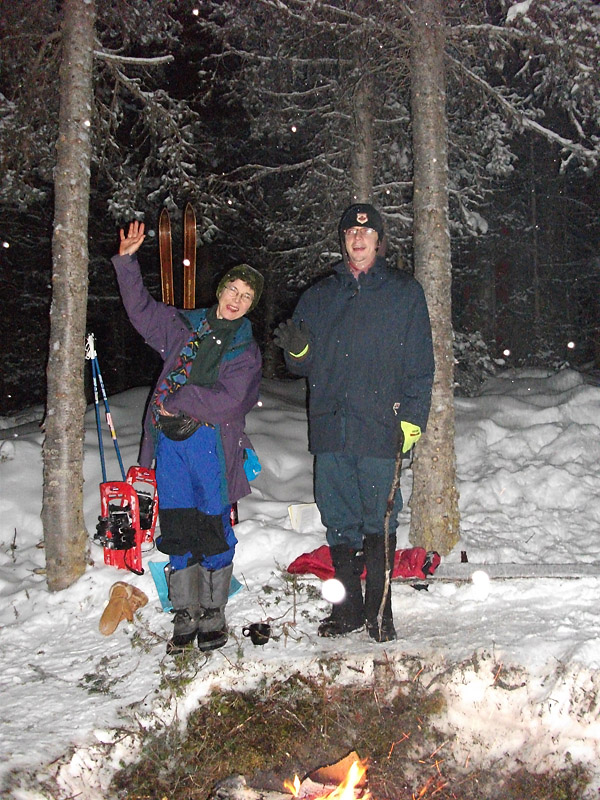 Claire Kujundzic & David Newberry warm up by the fire around 8 pm, Dec. 21; Bill Horne photo. |